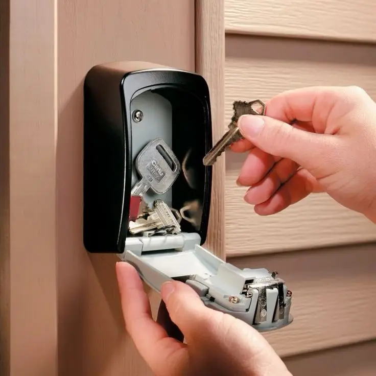 La boîte à clés noire se trouve fixée au mur, à droite du petit banc en bois.